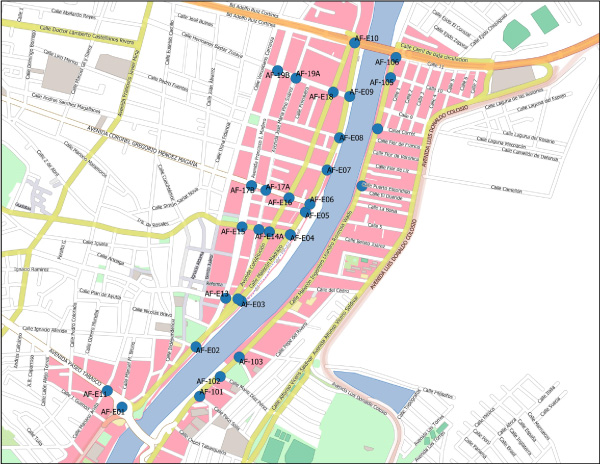 Ubicación de estaciones de aforos y puntos de Frecuencia de Ocupación Visual (FOV) del proyecto de intervención urbana integral del río Grijalva en la ciudad de Villahermosa