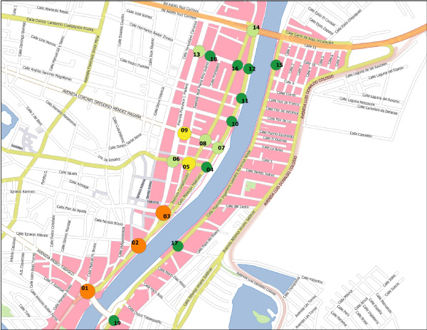 Ubicación de nodos de evaluación y niveles de servicio del proyecto de intervención urbana integral del río Grijalva en la ciudad de Villahermosa